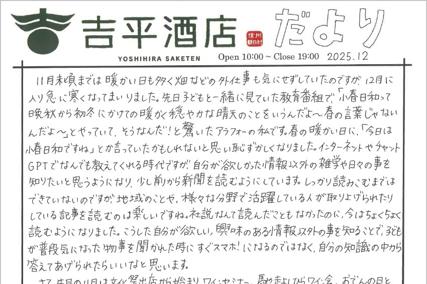 吉平酒店だより 2025年12月号です。PDF版はこちらから⇒吉平酒店便り 2025.12(PDF)以下画像はクリックで拡大表示されます。
