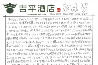 未分類 吉平酒店だより 2026.1・2合併号 出版記念イベントご報告 吉平酒店だより 2025年1月・2月の合併号です。PDF版はこちらから⇒吉平酒店便り 2026.1・2(PDF)以下画像はクリックで拡大表示されます。 2026.01.20 未分類